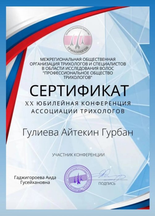 - "Медицинская Трихология" kursunun rəhbəri Trixoloq V.Tkaçyovun alopesiyanın müalicəsinə həsr olunmuş seminarında iştirak etmiş, sertifikat almışdır.
